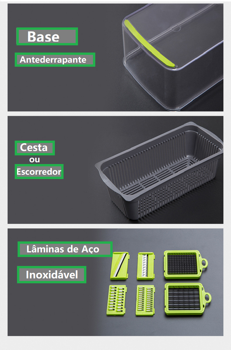 Nunca mais perca tempo procurando as lâminas! Nosso cortador multifuncional de Legumes Multiuso possui recipiente próprio para você guardar as lâminas, otimizando o seu tempo na hora de preparar seu alimento